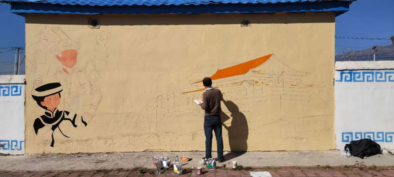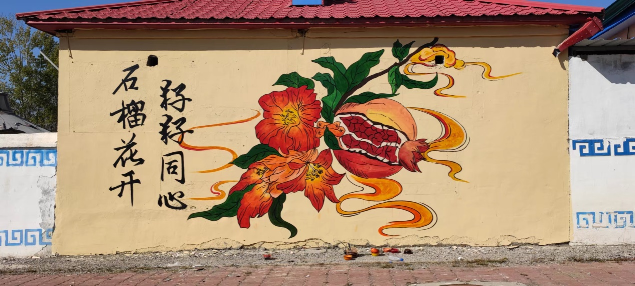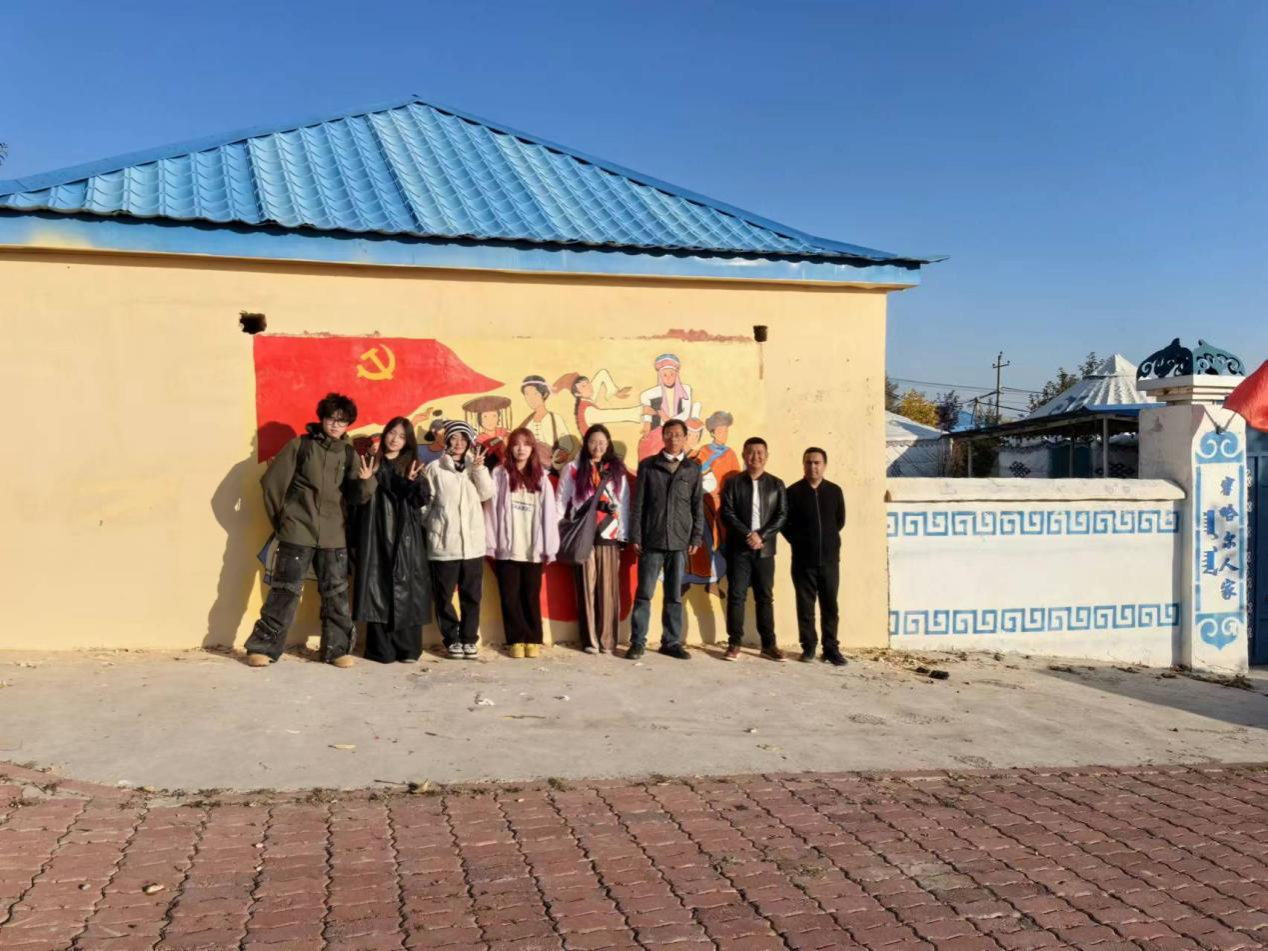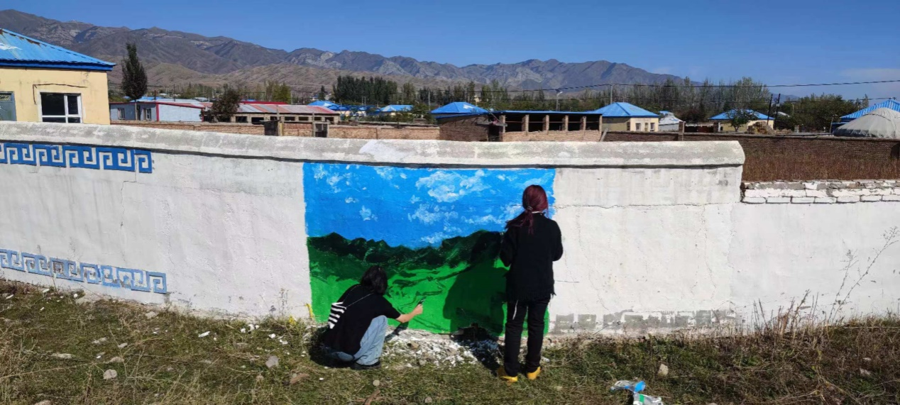 学院以此次赴疆实践为契机,深入实施“绘画援疆、文化润疆”实践项目,着力以专业特色“有形、有感、有效”铸牢中华民族共同体意识,以文化艺术赋能民族地区乡村振兴,提升党建工作质量。短短几天的活动期间,实验艺术学院漫评小组充分发挥共产党员先锋模范作用,克服任务繁重、节日思亲和天气干冷等诸多困难,在地处中哈边境高海拔的博州博乐市小营盘镇明格陶勒哈村顺利开展墙绘创作,实际共完成约40平米的墙画。墙画的主题是宣传以铸牢中华民族共同体意识为核心的民族团结,表现民族特色村寨明格陶勒哈村及附近的阿拉套山和夏尔西里的美丽自然风光,为以后的文旅开发奠定初步基础。我校实验艺术学院漫评小组的优美墙绘、精湛画艺、敬业精神和良好风貌受到了当地广大牧民、干部及边防人员的一致好评,为进一步在新疆地区宣传我校起到了积极作用。