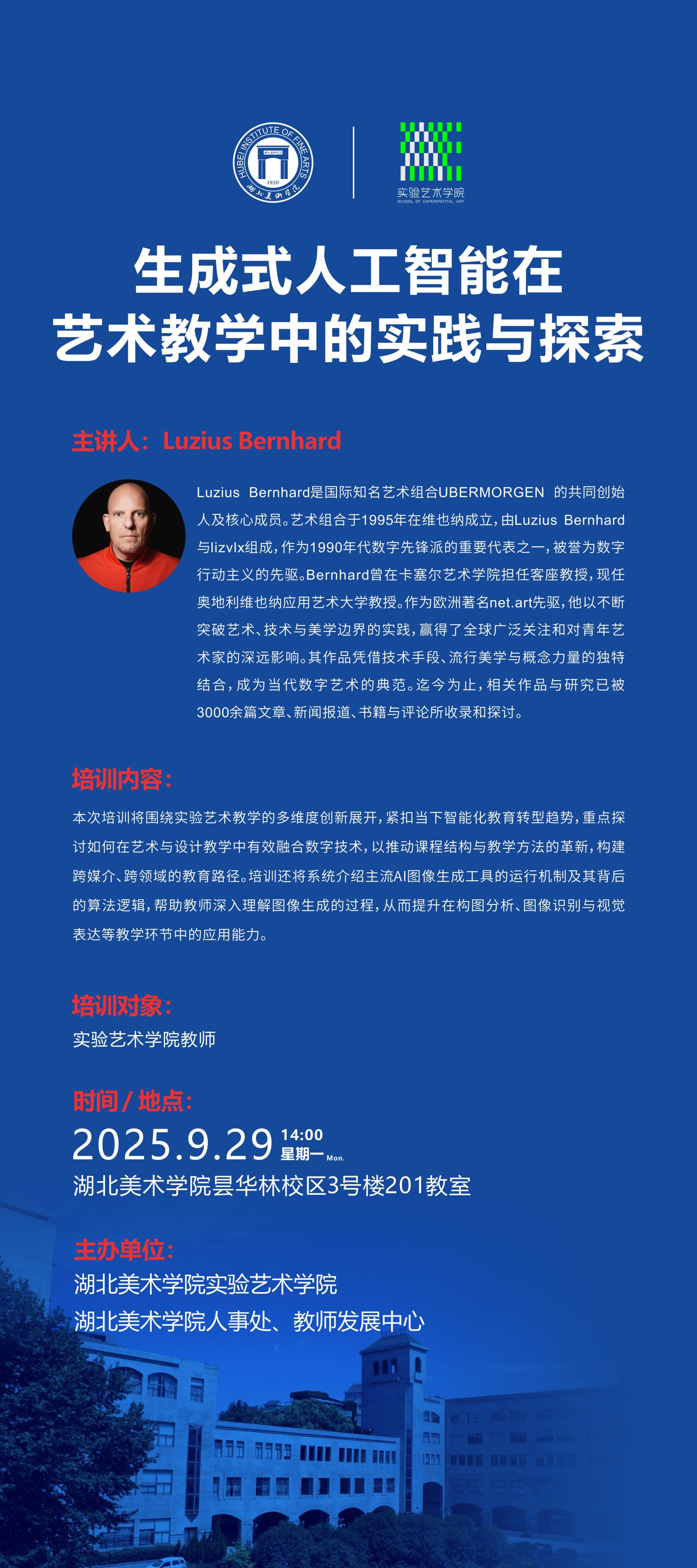本次活动特邀国际知名数字艺术家、奥地利维也纳应用艺术大学教授Luzius Bernhard担任主讲人,面向实验艺术学院教师开展人工智能与艺术教育融合的专题培训。