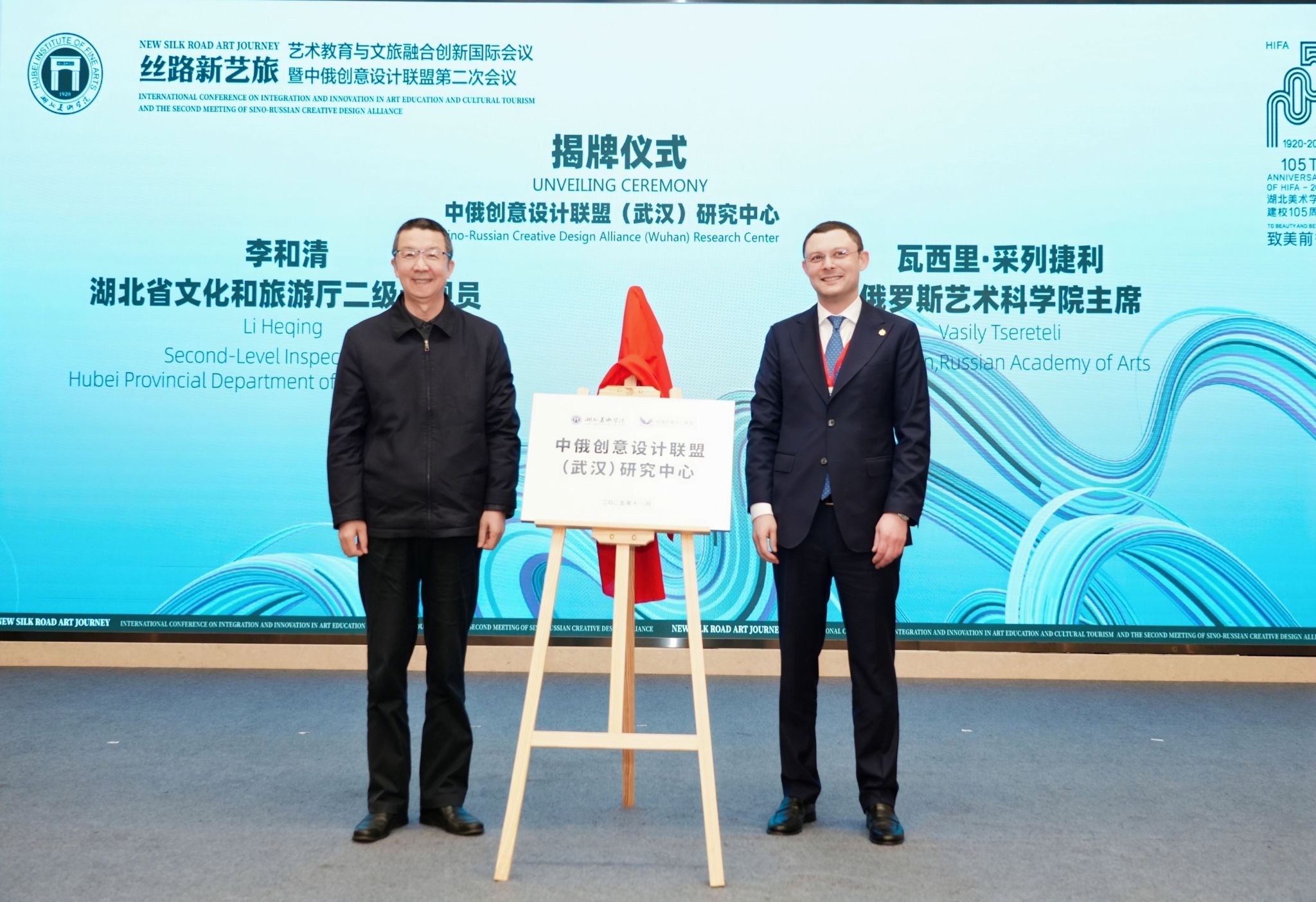 中俄创意设计联盟理事长、黑河学院校长杨敬民和俄罗斯苏里科夫美术学院副校长伊戈尔·戈尔巴秋克院士共同为“中俄创意设计专业集群”虚拟教研室揭牌。湖北省文化和旅游厅二级巡视员李和清和俄罗斯艺术科学院主席瓦西里院士共同为“中俄创意设计联盟(武汉)研究中心”揭牌。后期,各方将在人才培养、学术交流、艺术设计等多方面进行合作。