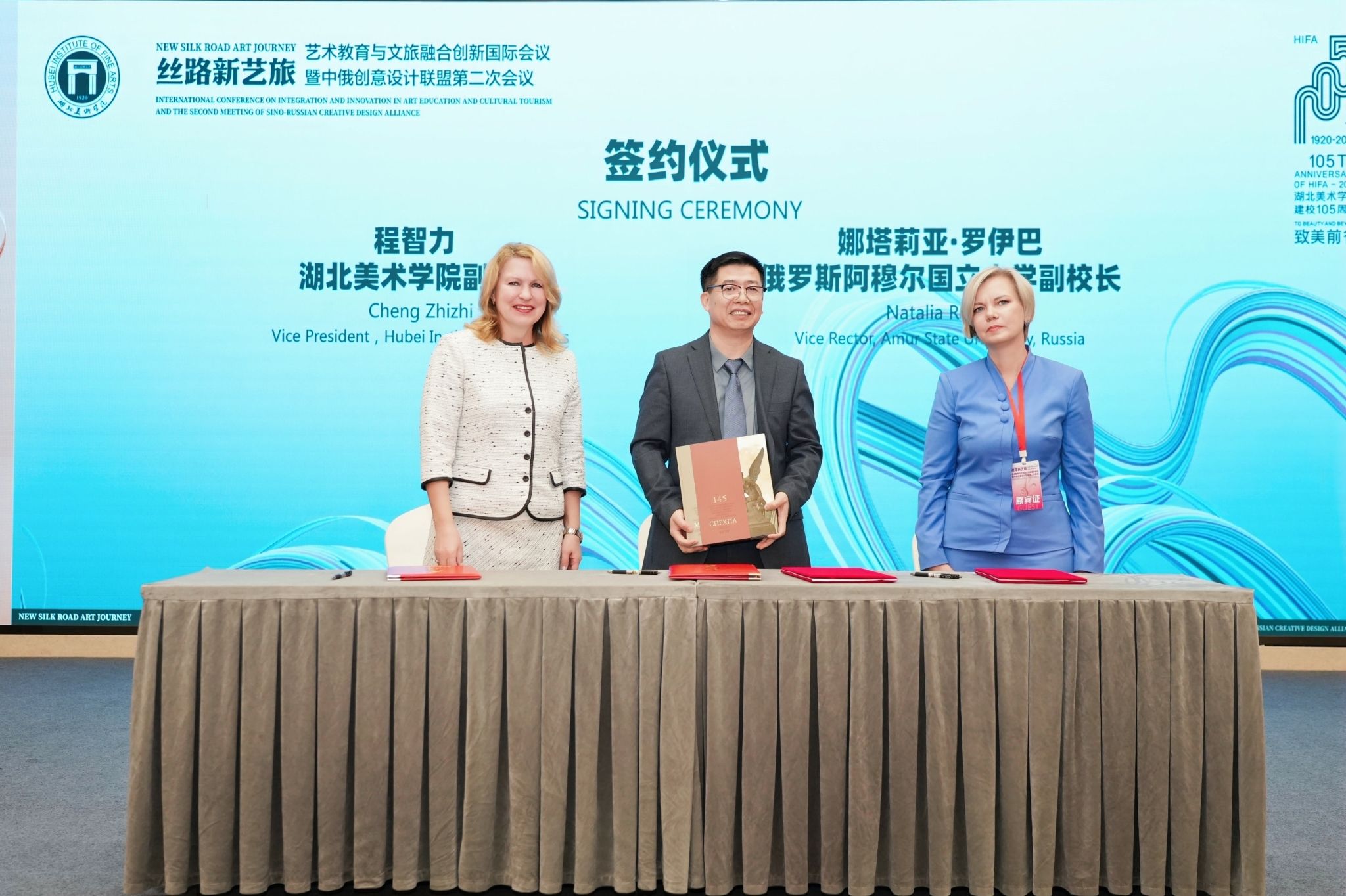 在中俄高校签约仪式环节,湖北美术学院党委常委、副校长程智力与俄罗斯阿穆尔国立大学副校长娜塔莉娅·罗伊巴和俄罗斯圣彼得堡国立工艺美术学院院长安娜·基斯利齐娜分别签订合作协议,共同开启中俄高校交流与合作新篇章。