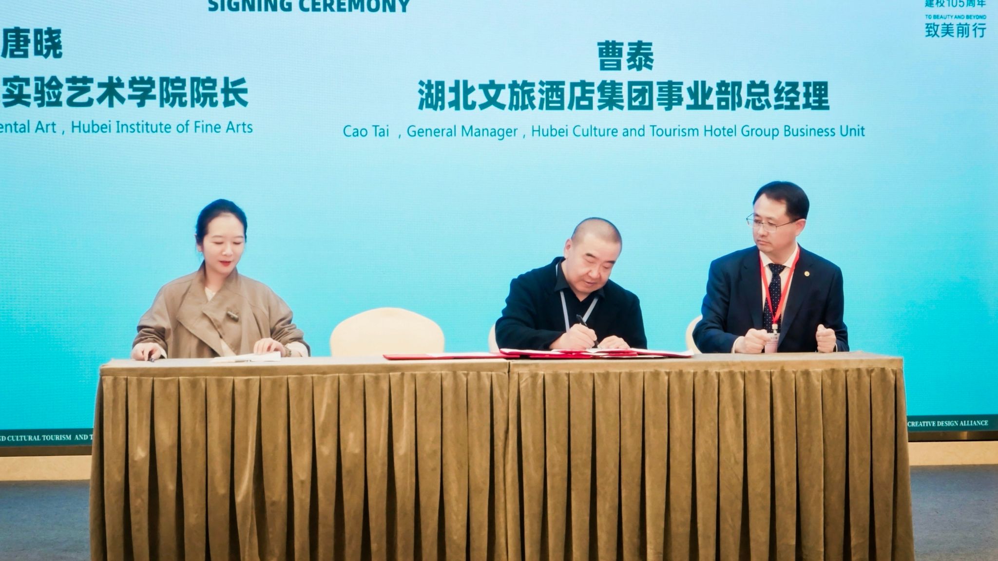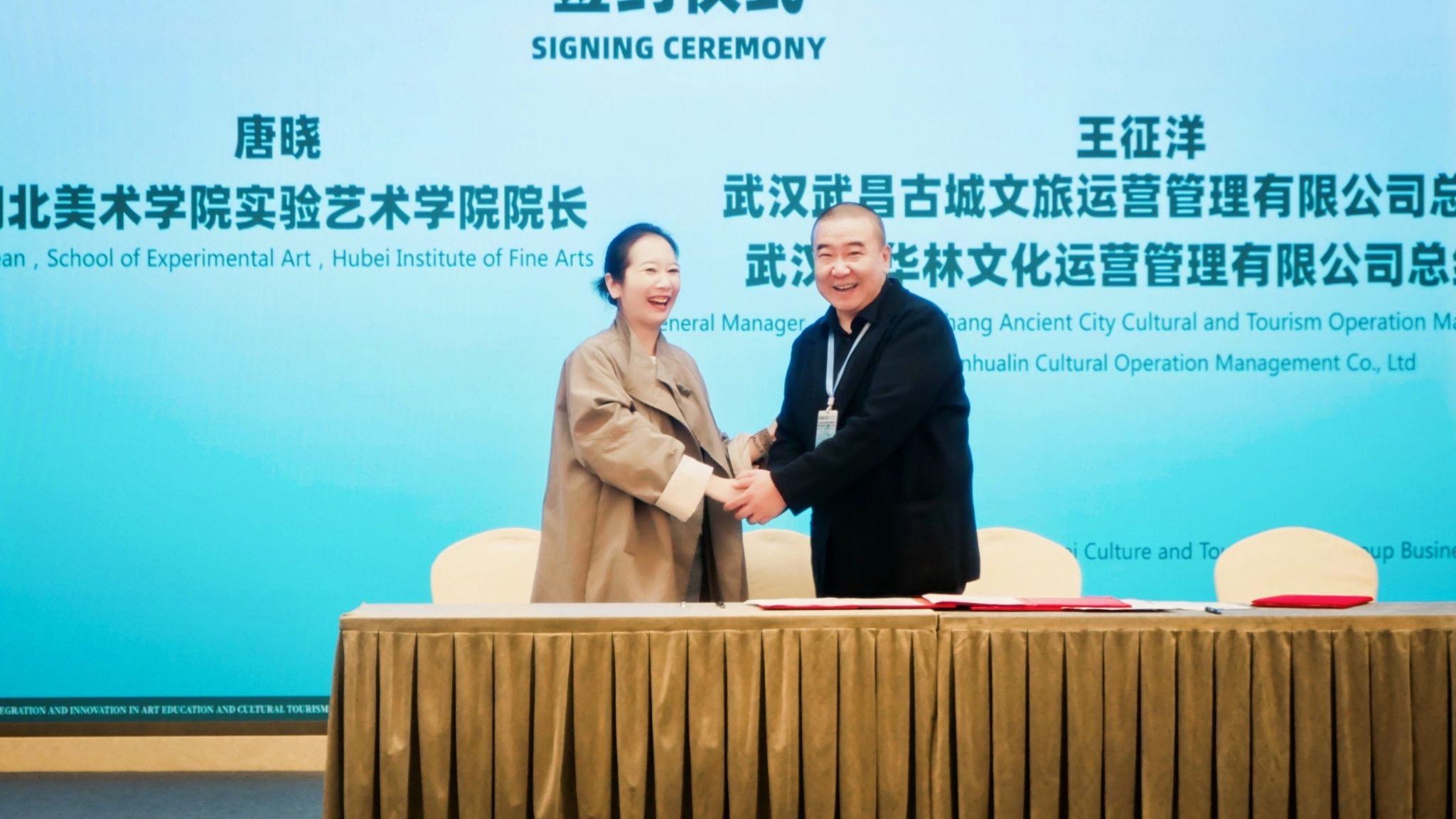 湖北美术学院实验艺术学院院长唐骁分别与武汉武昌古城文旅运营管理有限公司和湖北文旅酒店集团签订战略合作协议