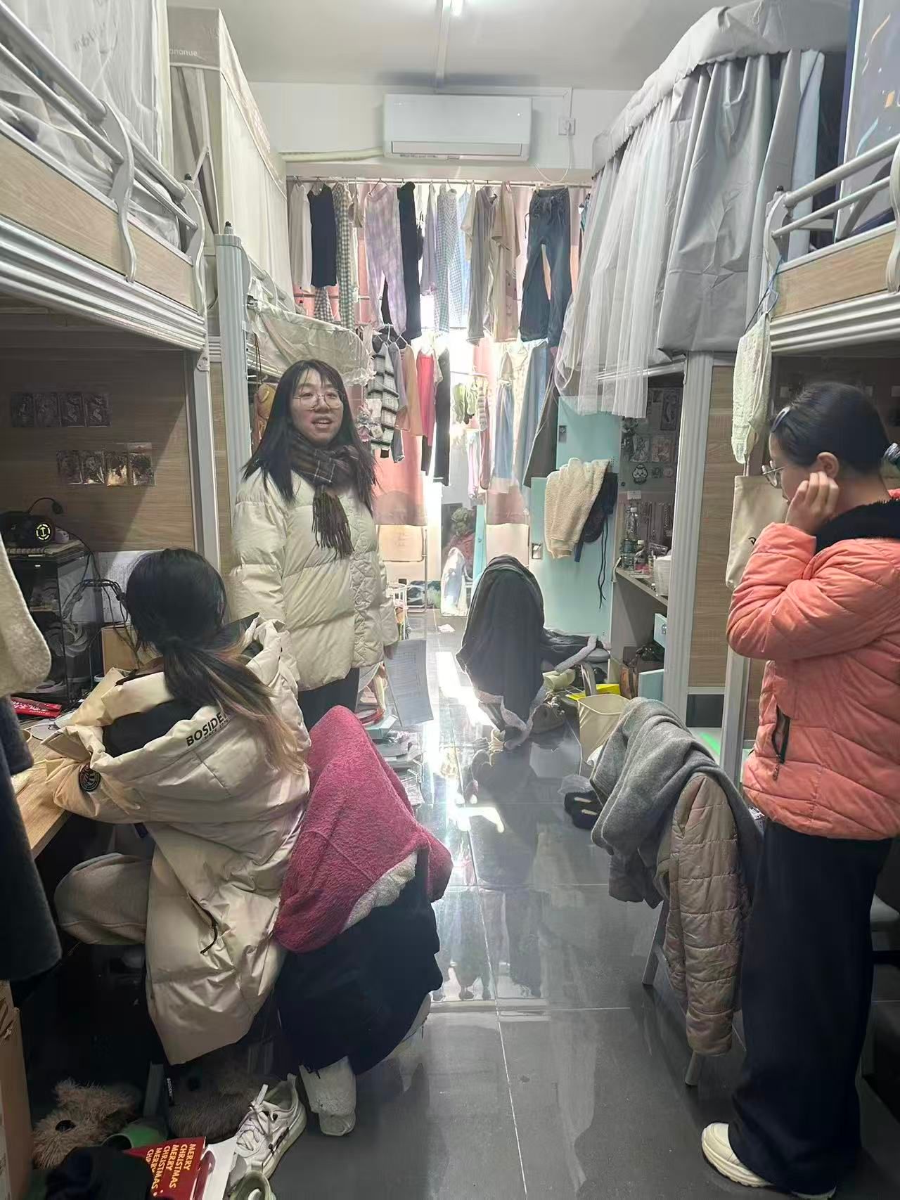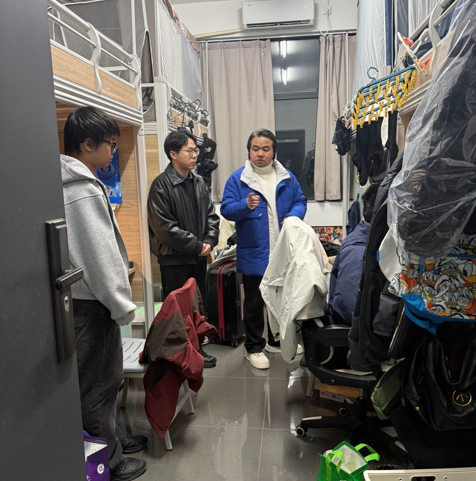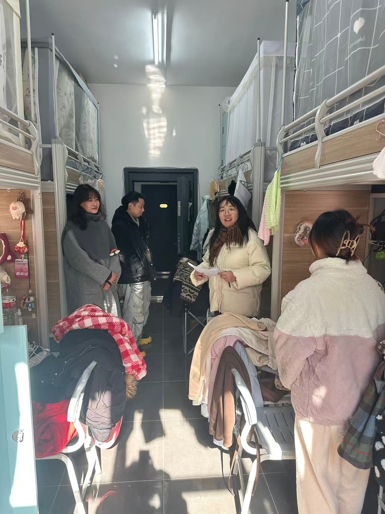 老师们与同学们亲切交流,了解日常住宿情况,对发现的安全隐患和卫生问题现场提出整改意见,并叮嘱同学们要牢固安全意识,自觉维持宿舍整洁,共同维护良好的集体居住环境。
