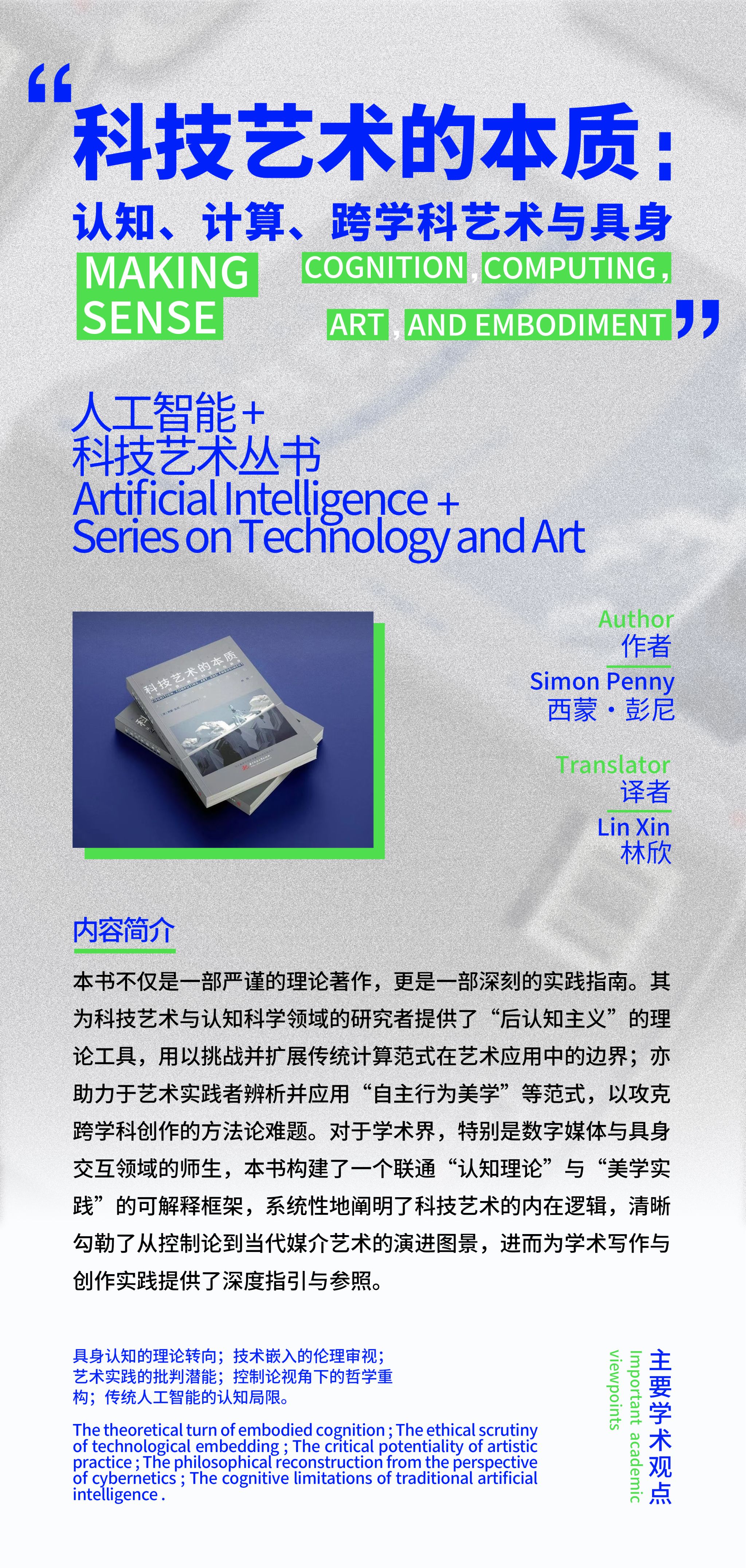 作为科技艺术领域的奠基性著作,本书提出了后认知主义范式以应对当下具身智能时代,深入剖析了认知、计算、跨学科艺术与具身四者之间复杂的互动关系。西蒙·彭尼教授凭借其横跨艺术创作、工程研究和跨学科理论的深厚背景,以后认知主义为理论基石,对传统计算主义将思维与肉身割裂的范式提出了深刻挑战。