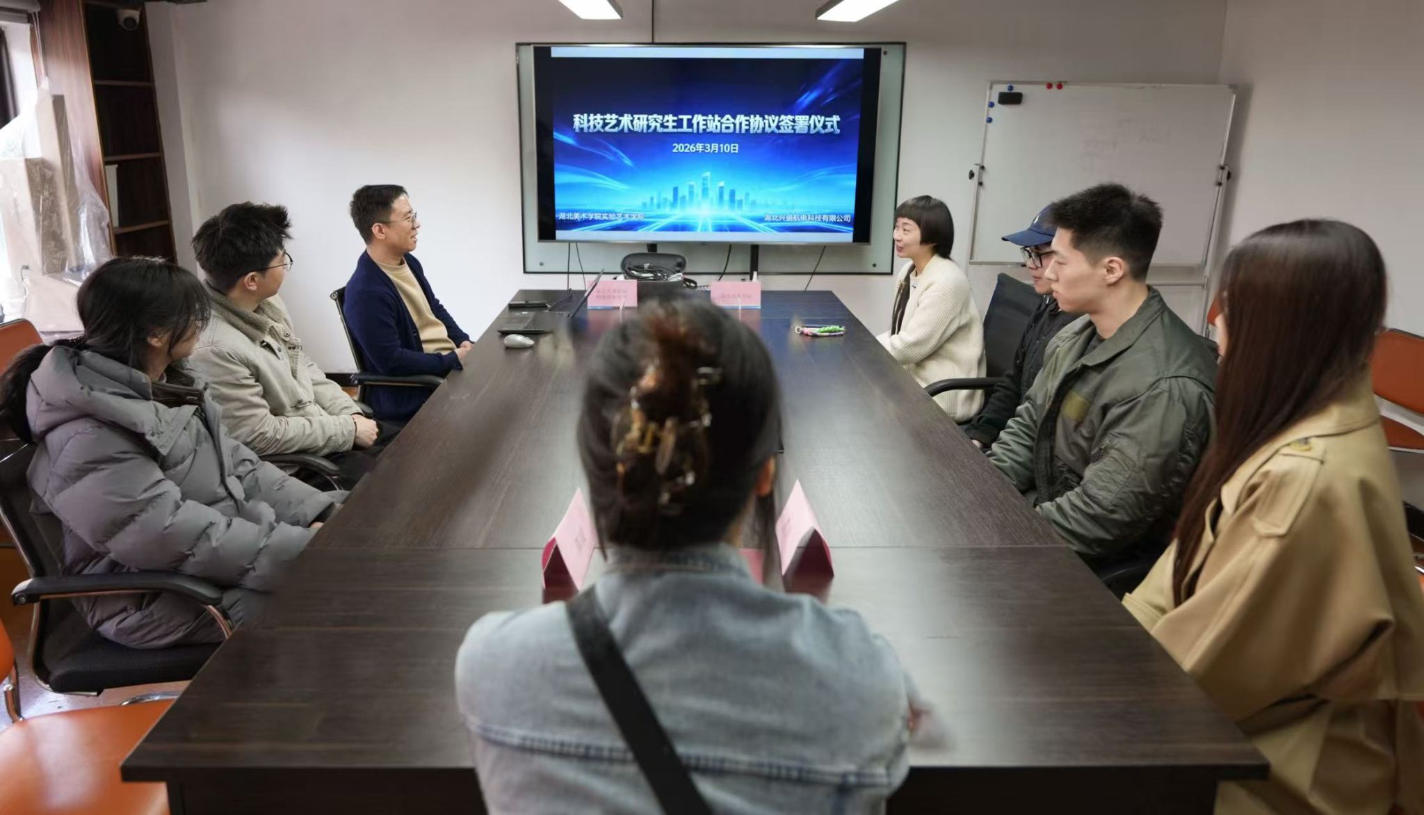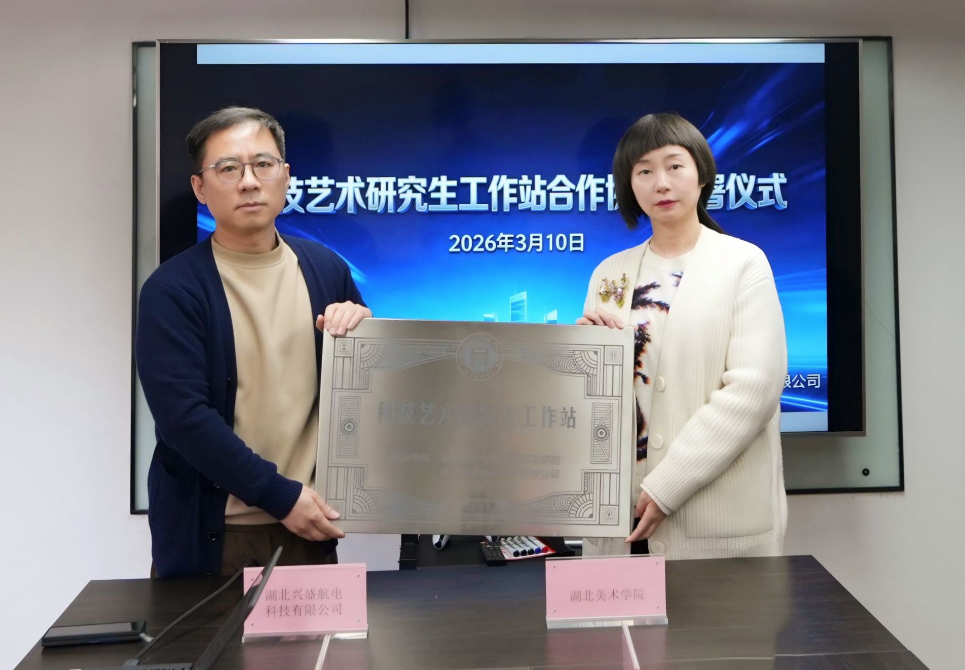 2026年3月11日下午2:30,实验艺术学院与湖北兴盛航电科技有限公司共建科技艺术研究生工作站揭牌仪式在湖北兴盛航电科技有限公司研发中心隆重举行。实验艺术学院科技艺术PI工作室负责人林欣教授、湖北兴盛航电科技有限公司经理白俊伟及双方相关部门负责人、科技艺术PI工作室研究生代表共同出席仪式,见证校企合作新起点。
