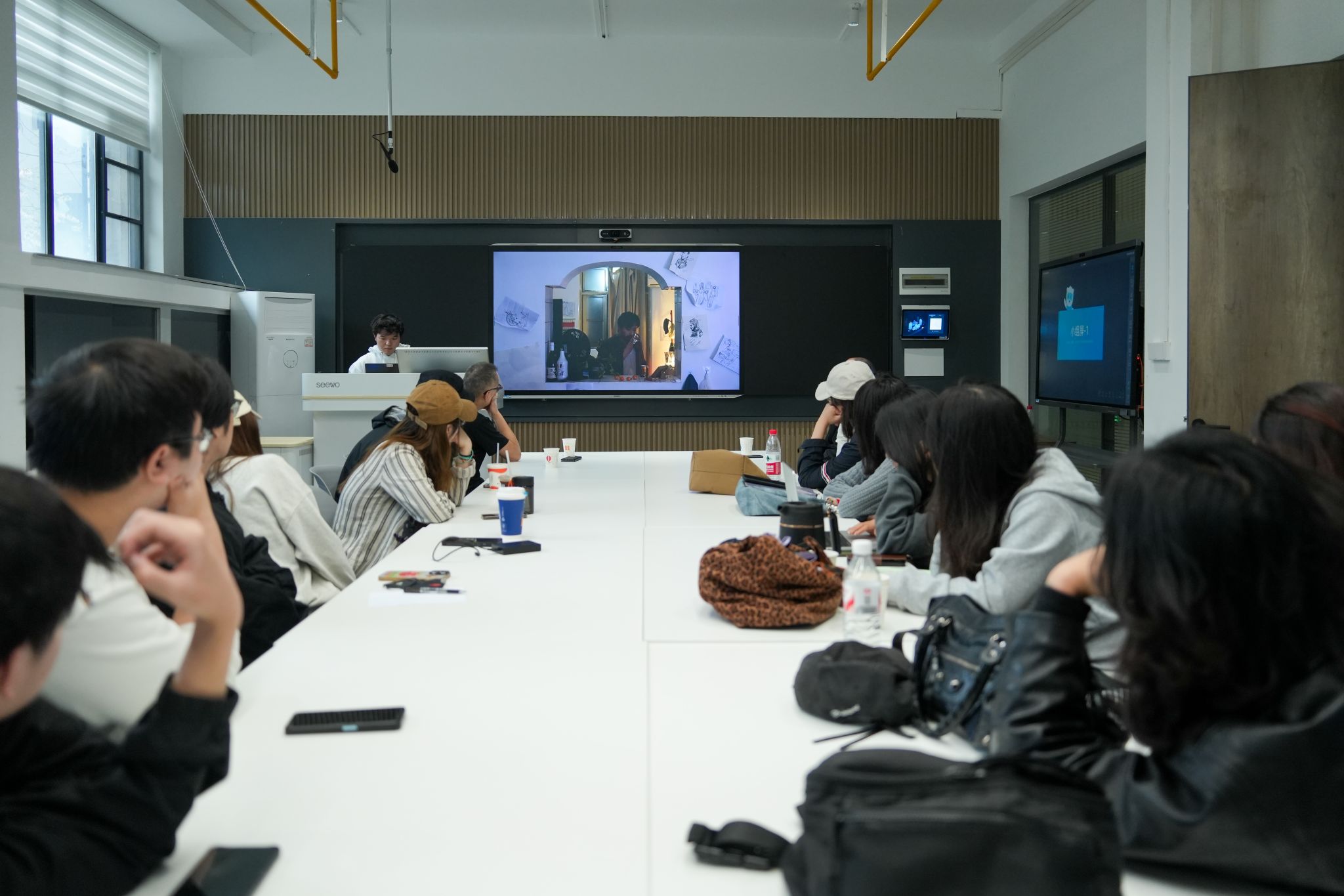 他结合自身三十余年艺术创作历程,通过展示实验影像代表作品,系统梳理了从“实验影像” 到 “空间影像” 的观念转变与创作实践路径。他从创作者视角出发,深入阐述了影像艺术在媒介表达、空间叙事、文化内核等层面的演变逻辑:实验影像阶段注重对传统媒介的突破与形式探索,而空间影像则进一步将影像从二维屏幕拓展至三维实体空间,以空间叙事重构观众的感知体验,同时融入中国传统山水美学精神,使影像创作兼具当代性与文化根性。还结合具体创作案例,分享了空间影像在展览呈现、观众互动、文化表达等方面的实践经验,探讨了跨媒介融合、技术赋能与艺术本体表达的平衡关系,为在场师生提供了全新的创作思路与研究视角。